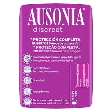 Ausonia Discreet cuenta con un núcleo ultrafino RapidDry para ofrecer protección contra las pérdidas y con gran discreción