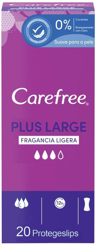 Los protectores diarios grandes Carefree Plus están diseñados para brindar una protección adicional duradera y hasta 12 horas de protección contra el olor. El protegeslip grande es más ancho y largo que los protegeslip Carefree Cotton para ofrecer una mayor protección que antes. Con una nueva cubierta Soft Touch que ayuda a absorber el flujo rápidamente y un núcleo súper absorbente que ayuda a retener la humedad al instante. Este producto te ayudará a sentirte fresca y protegida durante todo el día.