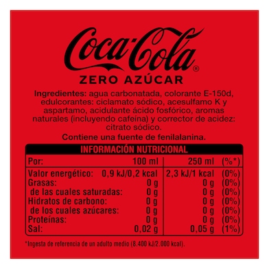 Ingredientes: Agua carbonatada, colorante E-150d, edulcorantes: ciclamato sódico, acesulfamo K y aspartamo, acidulante ácido fosfórico, aromas naturales, aroma cafeína y corrector de acidez: citratos de sodio.