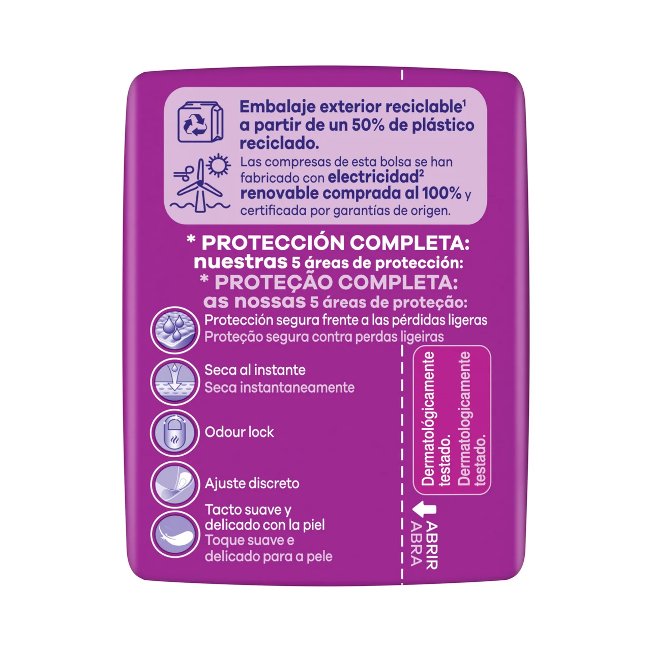 Cada compresa está diseñada para ofrecerte una protección de confianza contra las pérdidas, control de olor, sensación de sentirte seca al instante y un tacto suave y delicado con la piel, a la vez que se ajusta discretamente a tu cuerpo.